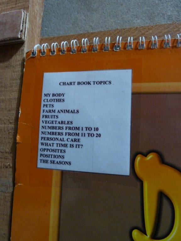 24 – Label: A label detailing the contents of a book of posters, which we use for our lessons.